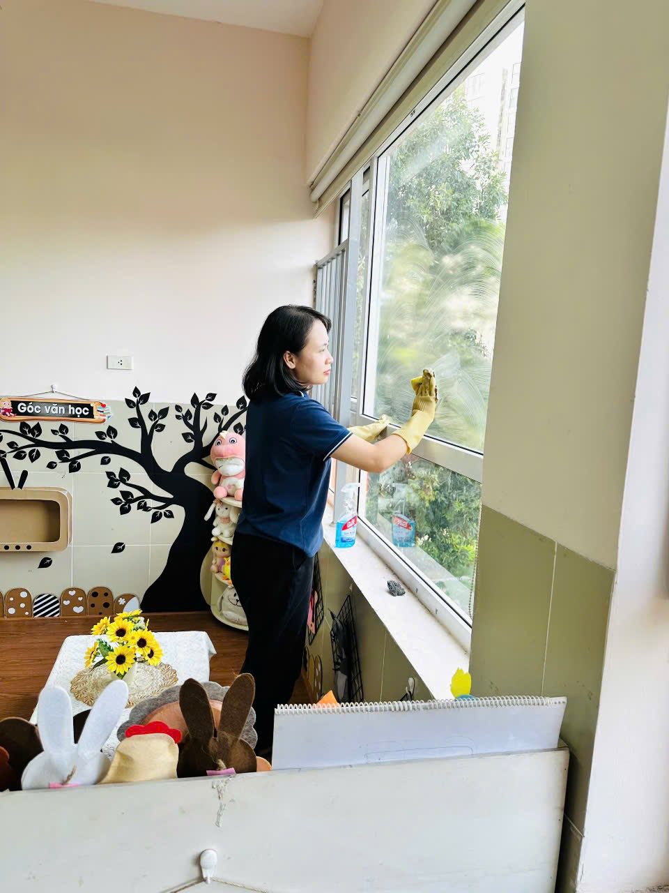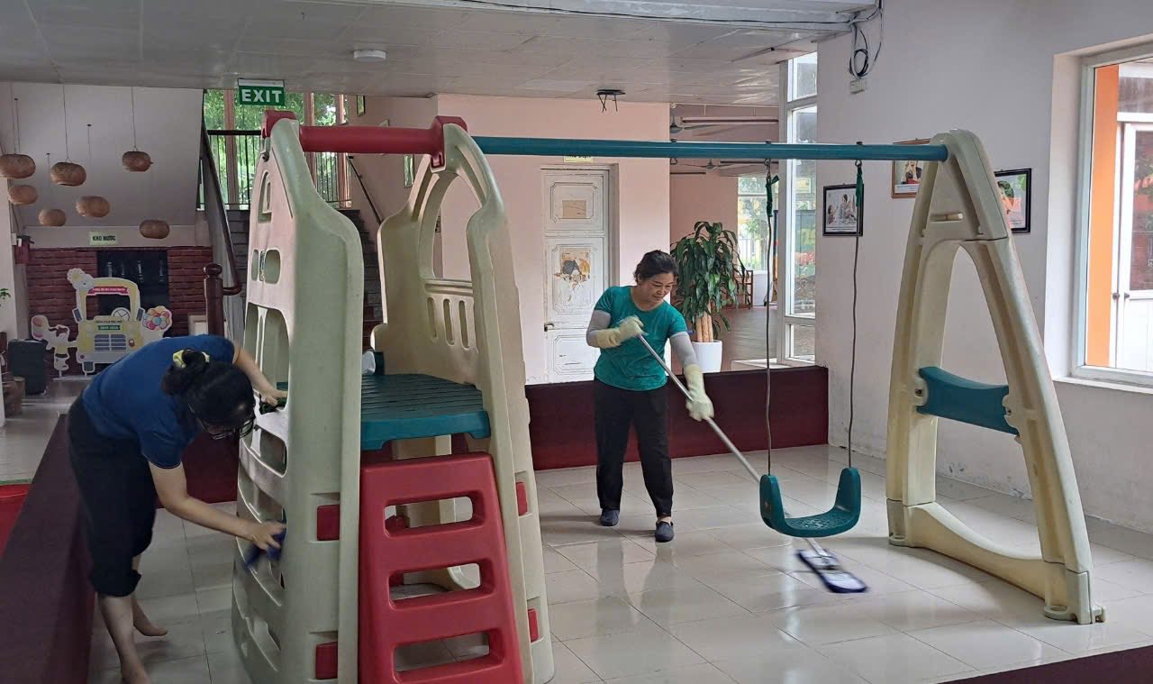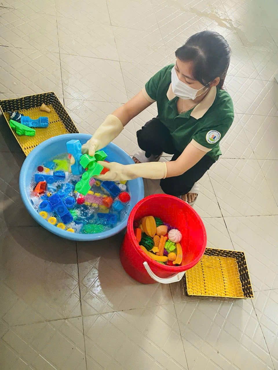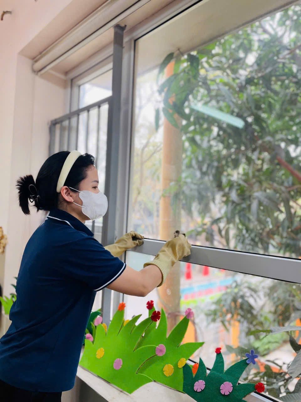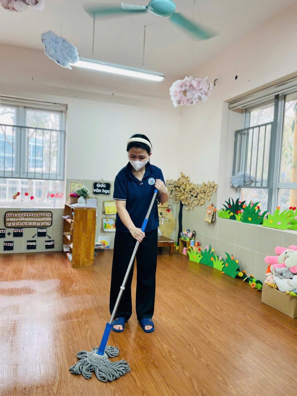 Từng bồn hoa được nâng niu, từng chiếc lá rơi được quét sạch, từng góc sân, lớp học, khu bếp và khu vui chơi chung của trẻ đều được chăm chút, lau dọn, sắp xếp gọn gàng bằng cả tấm lòng yêu nghề, mến trẻ