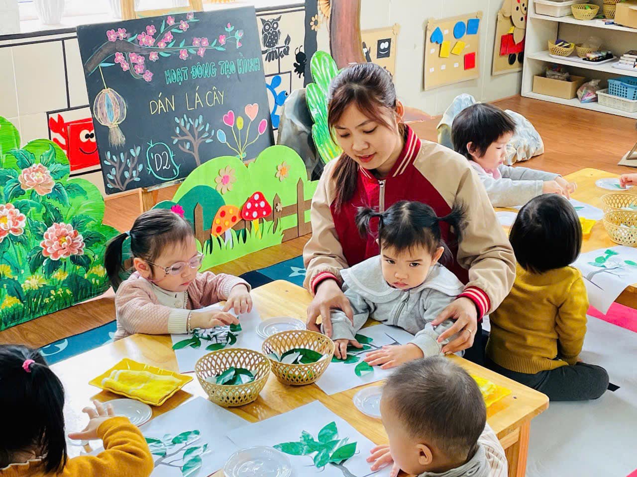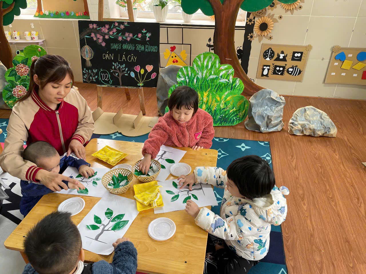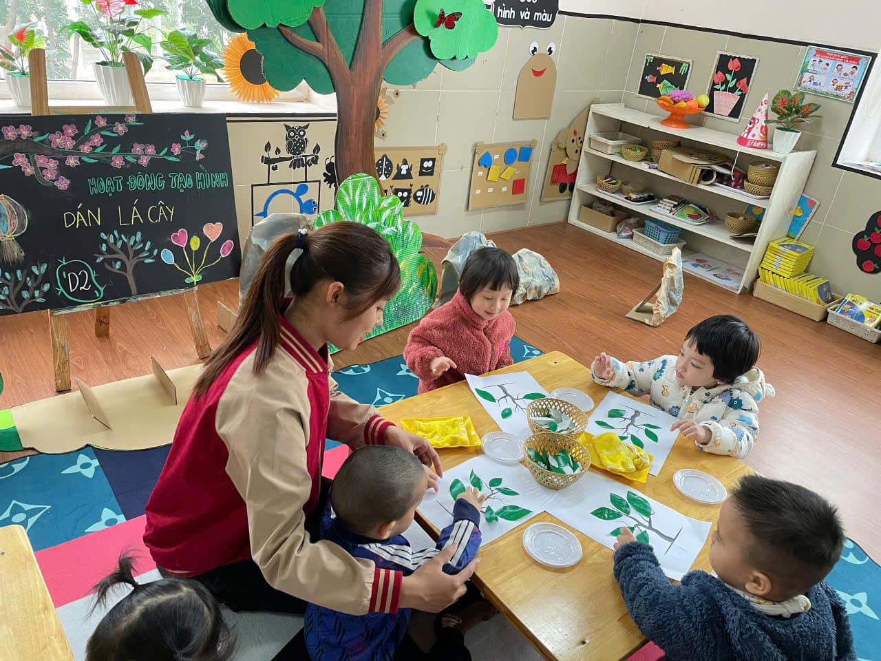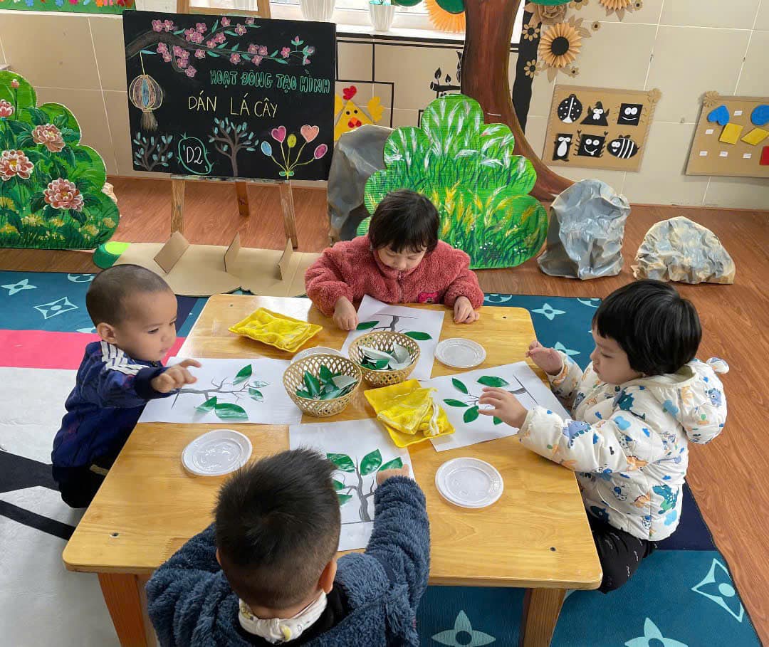 từ đó hình thành thói quen cho trẻ biết yêu quý, chăm sóc và bảo vệ cây xanh. Qua hoạt động trẻ có kỹ năng chấm hồ, phết hồ khi dán, trẻ biết cách bố cục bức tranh hài hoà, hợp lý.