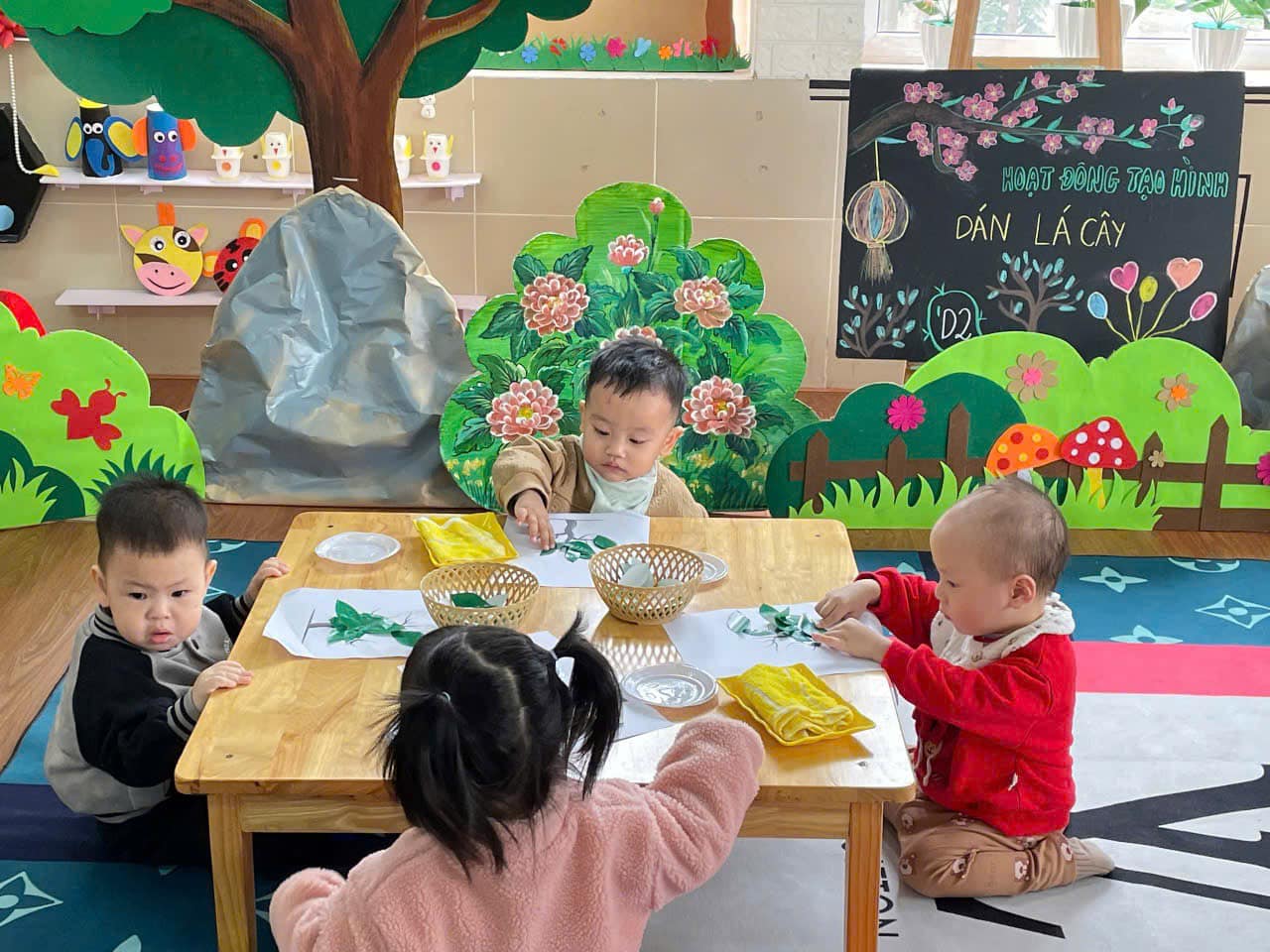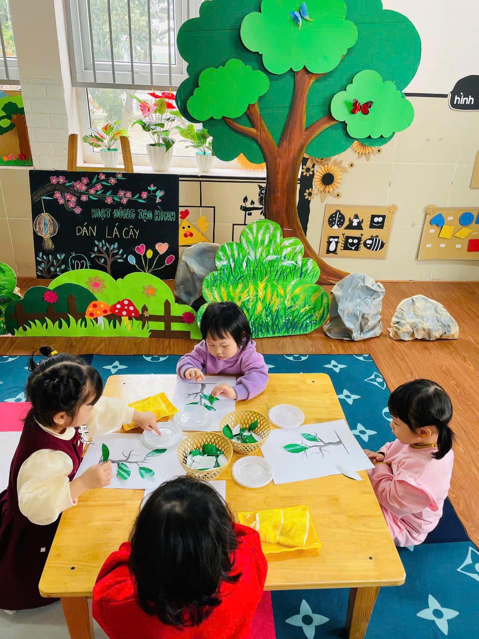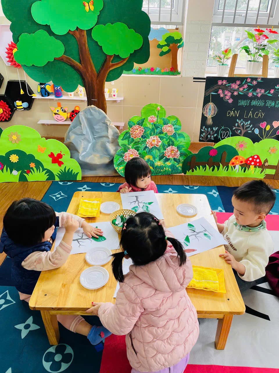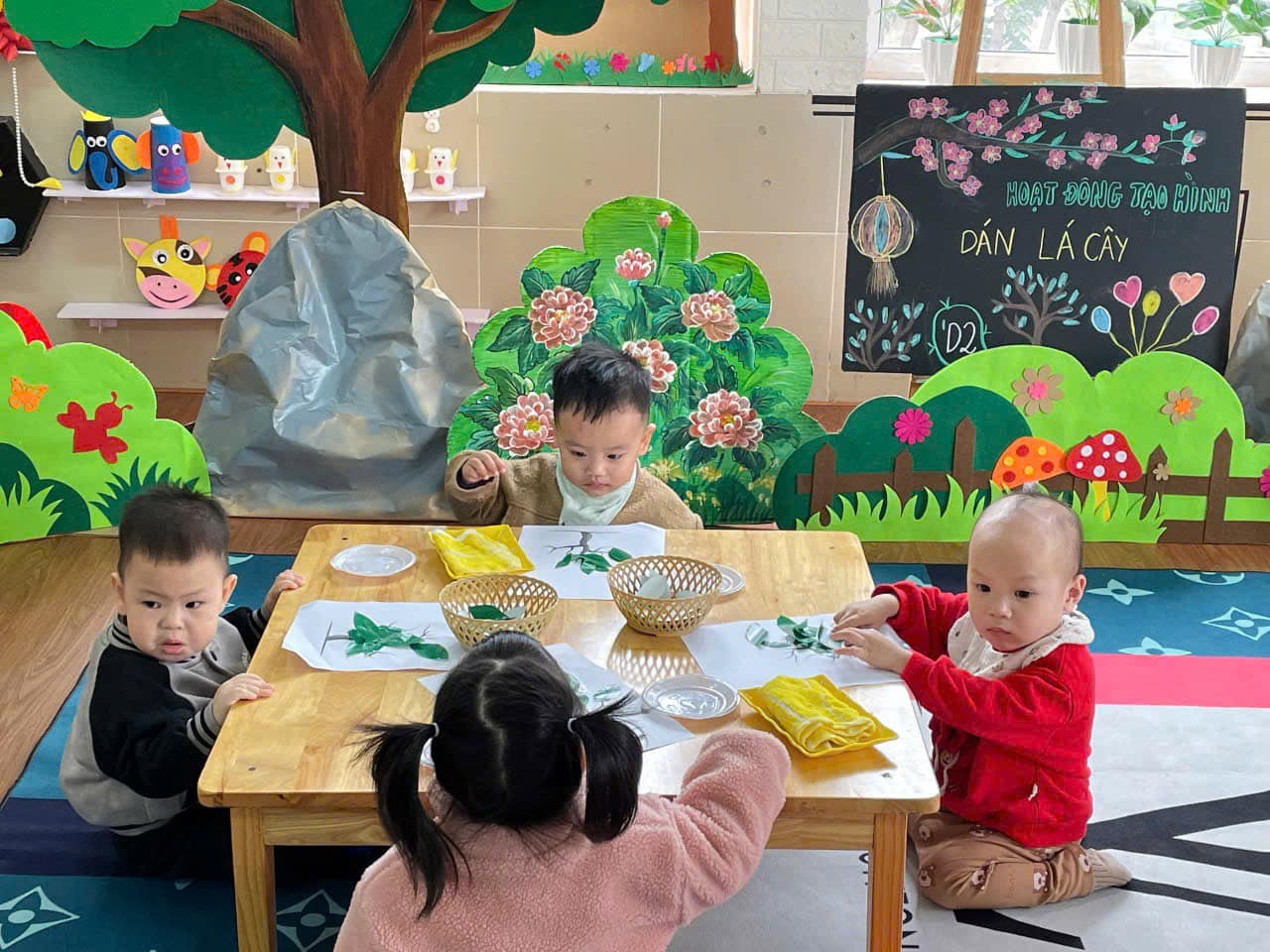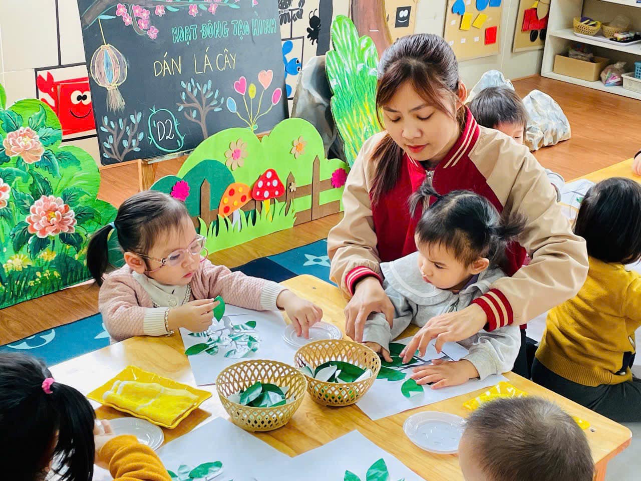 từ đó hình thành thói quen cho trẻ biết yêu quý, chăm sóc và bảo vệ cây xanh. Qua hoạt động trẻ có kỹ năng chấm hồ, phết hồ khi dán, trẻ biết cách bố cục bức tranh hài hoà, hợp lý.