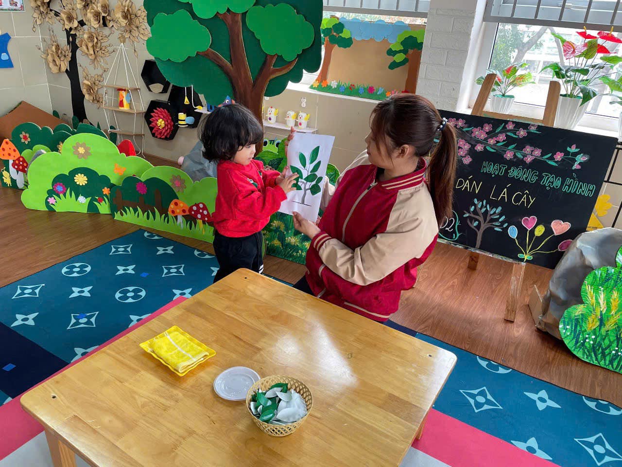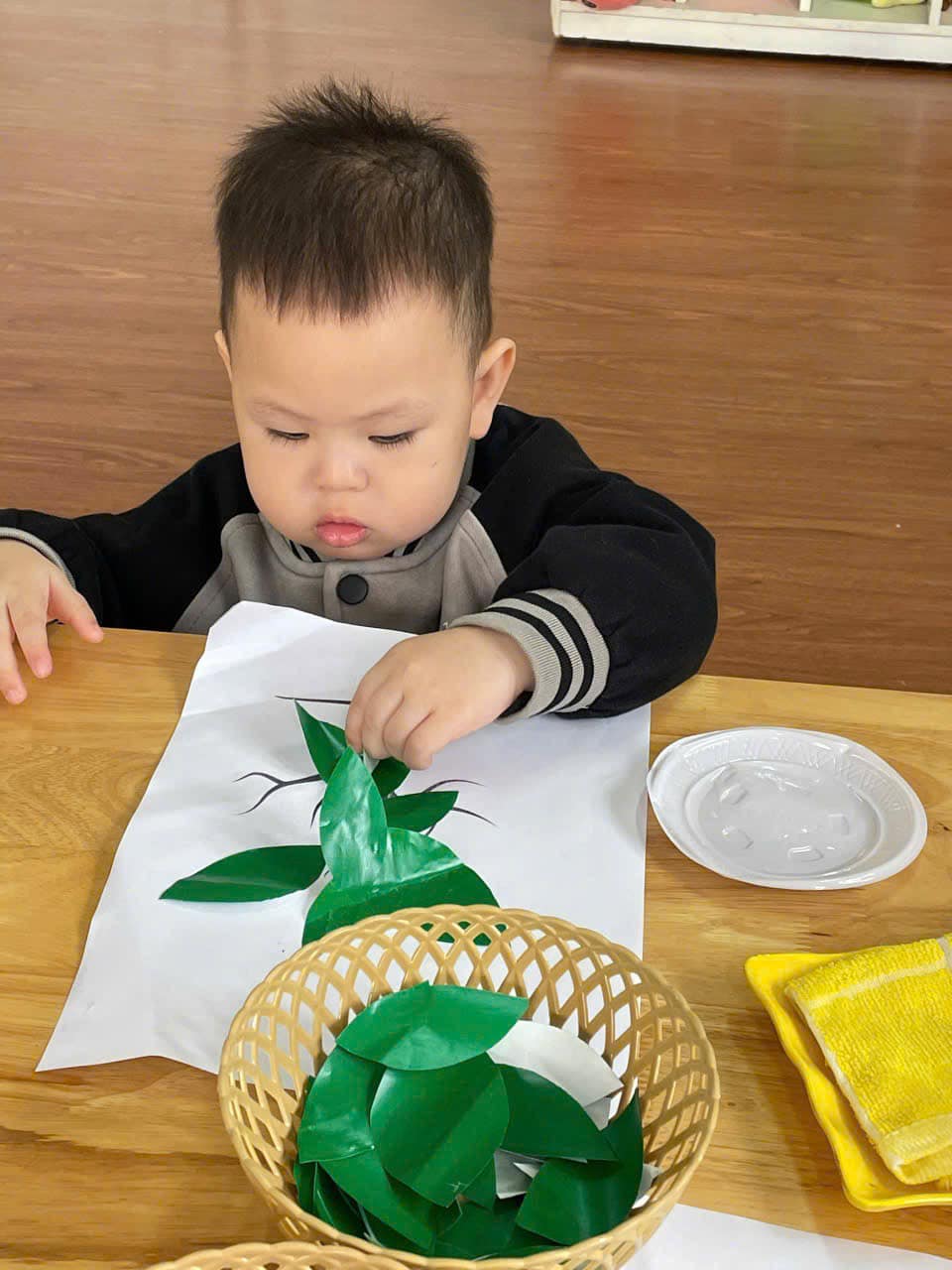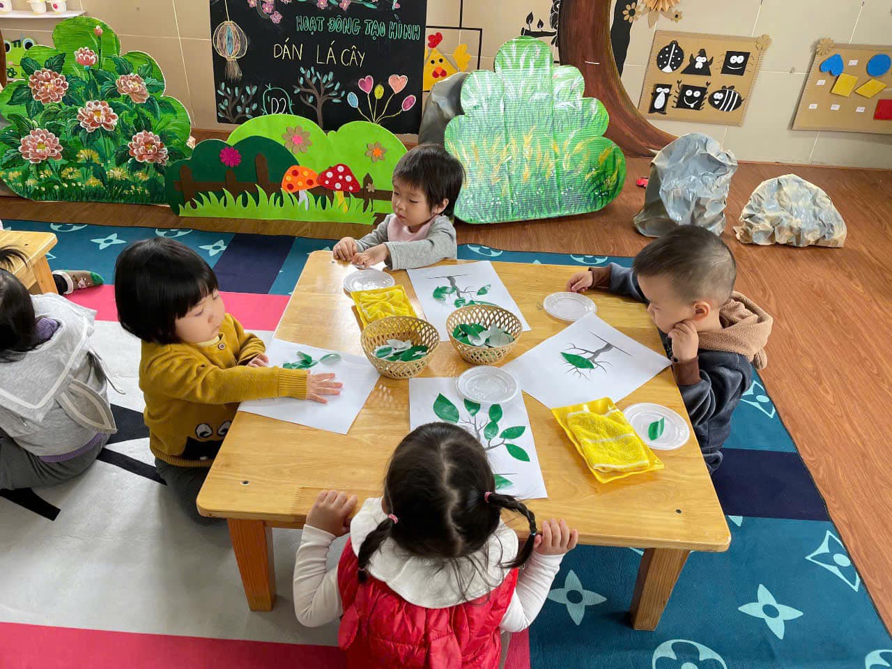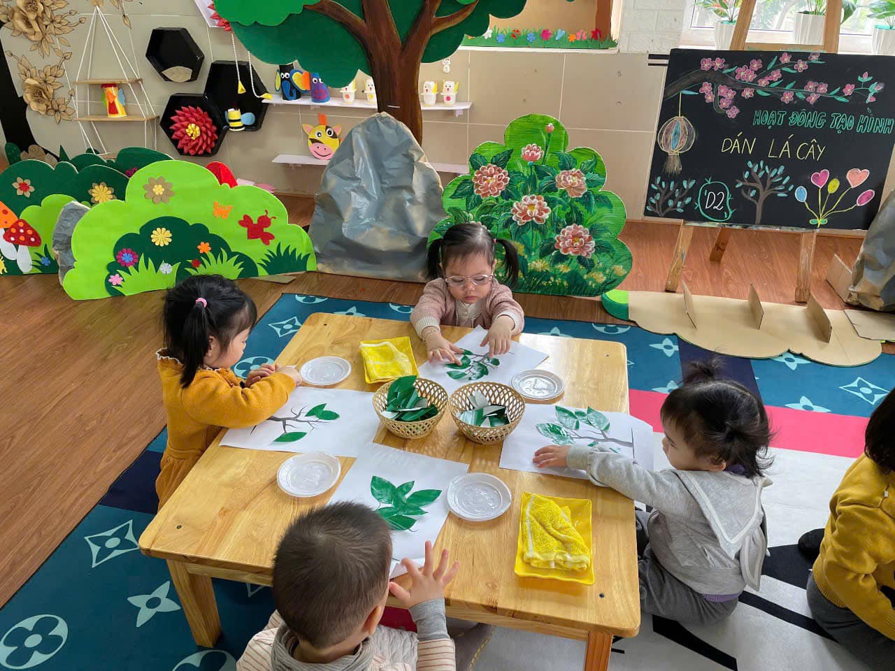từ đó hình thành thói quen cho trẻ biết yêu quý, chăm sóc và bảo vệ cây xanh. Qua hoạt động trẻ có kỹ năng chấm hồ, phết hồ khi dán, trẻ biết cách bố cục bức tranh hài hoà, hợp lý.