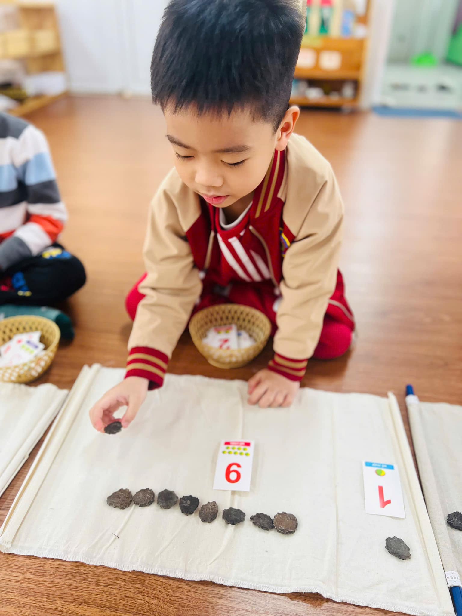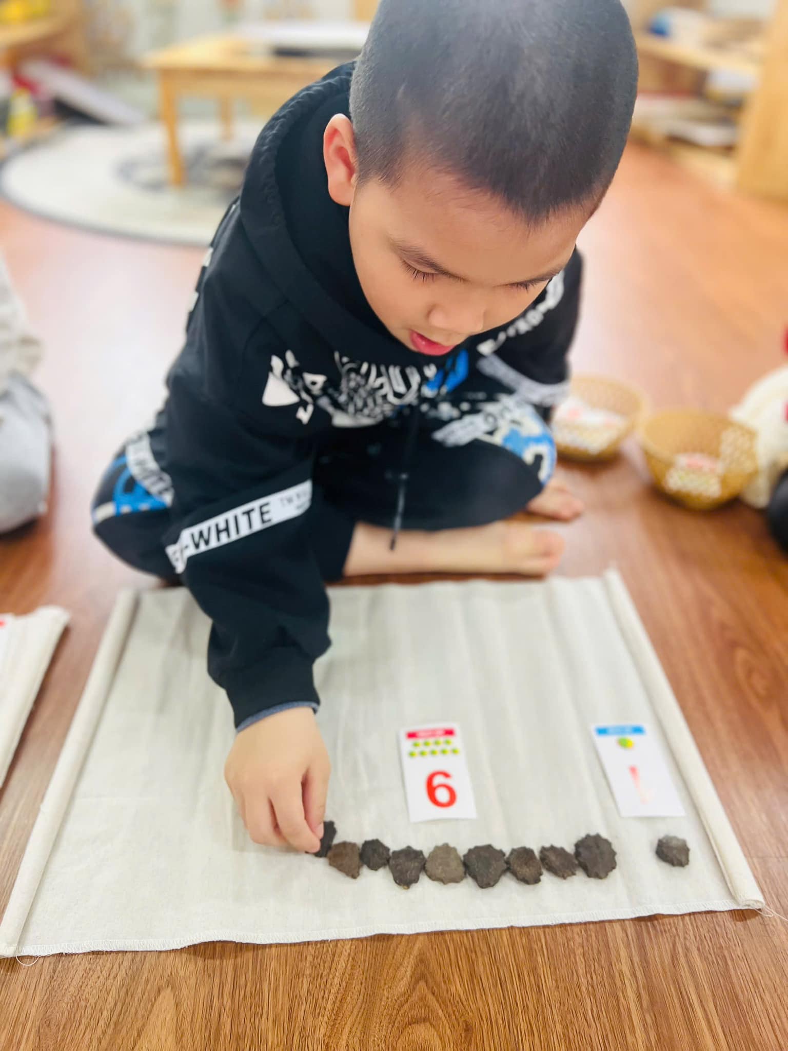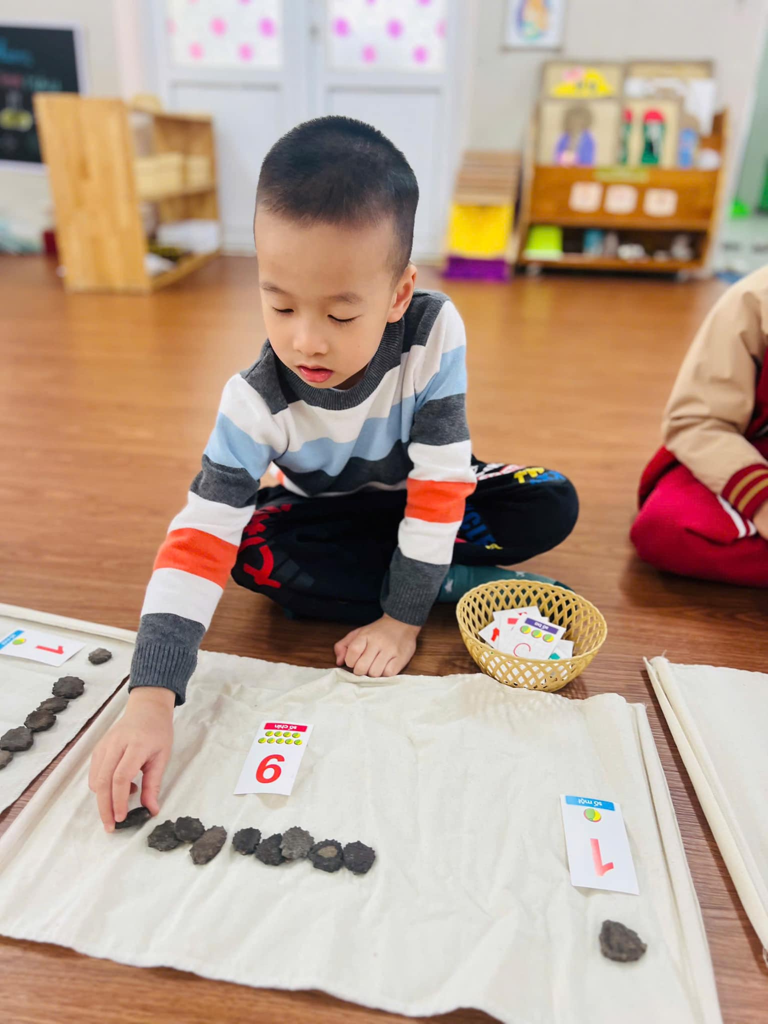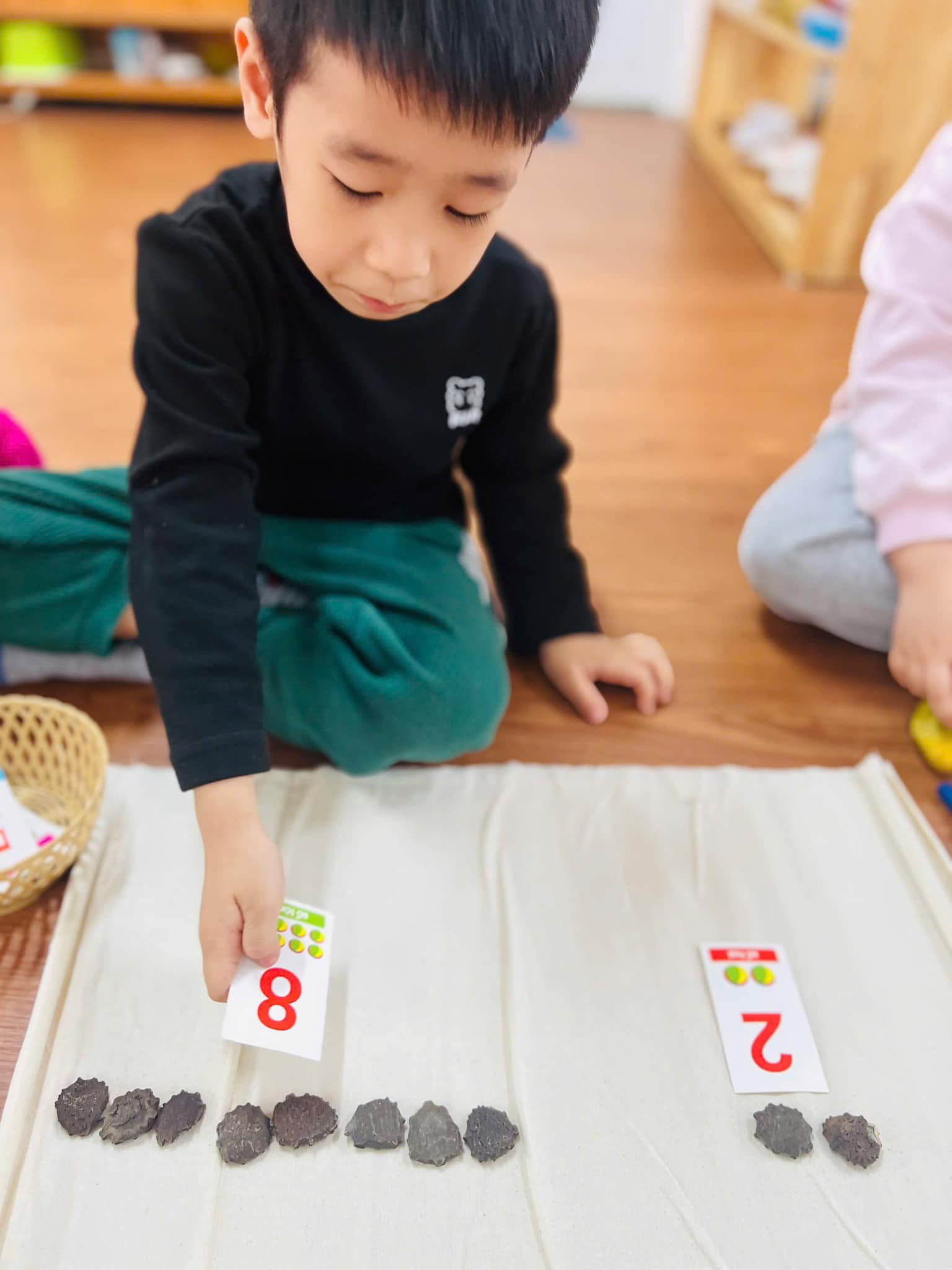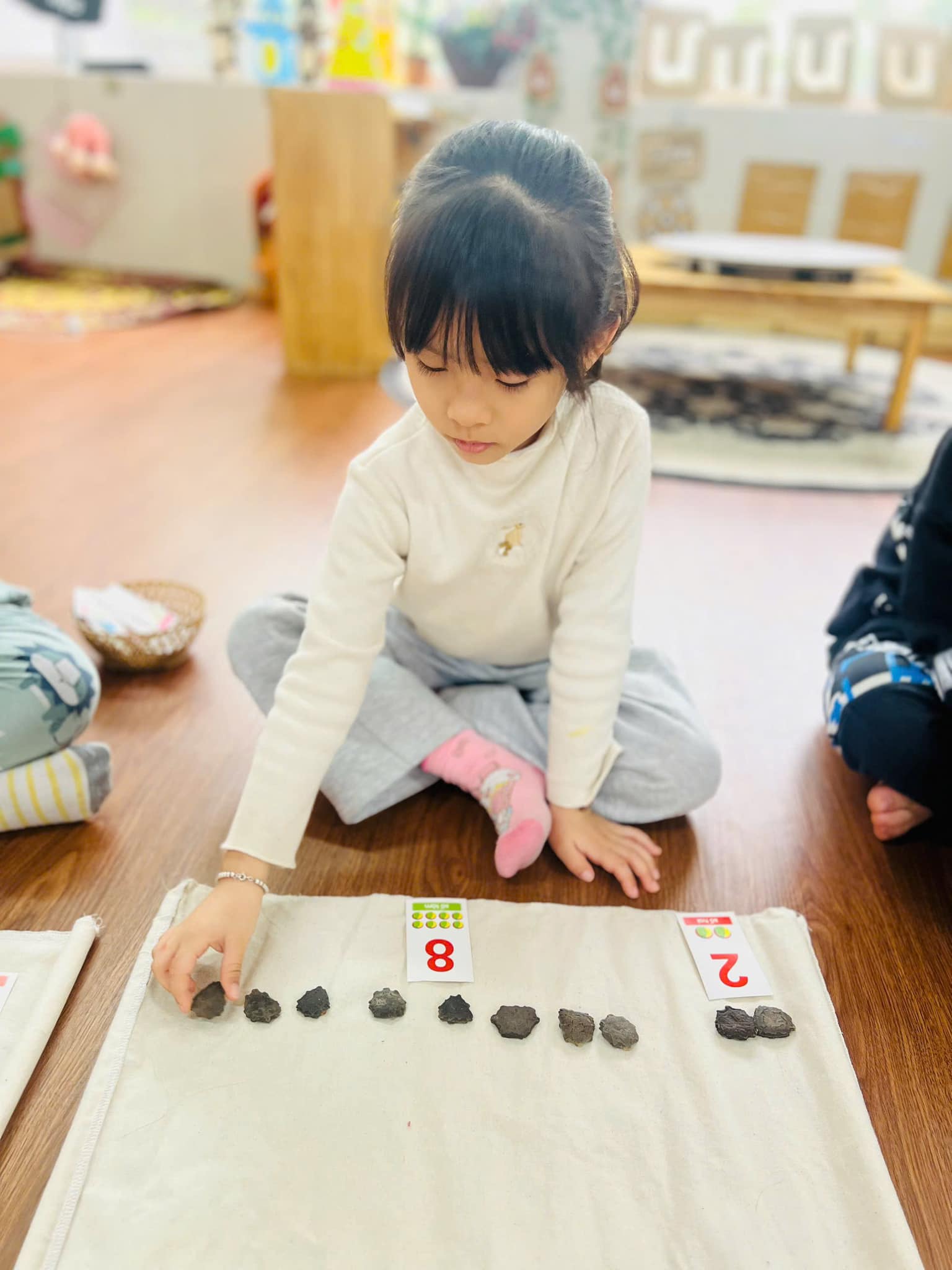 Các bạn lớp Mẫu giáo lớn A2 rất háo hức tham gia vào hoạt động với các con số. Thông qua các hoạt động học, các trò chơi hay làm bài tập củng cố, các bạn nhỏ đã nắm vững các khái niệm đơn giản về số lượng, kích thước, hình dạng, định hướng không gian, thì sau này các bạn sẽ vững vàng, tự tin khi tiếp nhận những kiến thức của môn toán học ở lớp một.